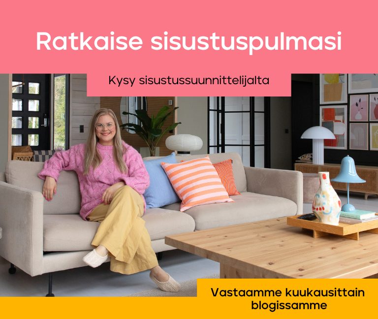 Valitsemme kuukausittain yhden kysymyksen, johon sisustussuunnittelijamme Jenni antaa ratkaisuehdotukset blogissamme. Valitun kysymyksen lähettänyt saa 100 euron lahjakortin sisustusmuutosten toteuttamiseen. Ilmoitamme valitulle henkilökohtaisesti.
