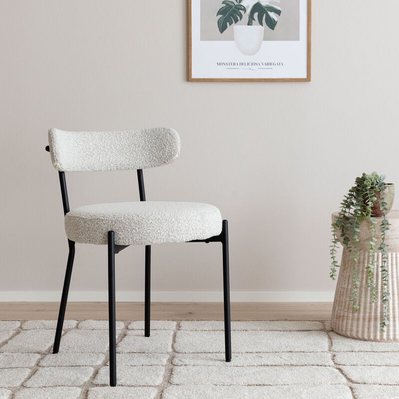 Pehmeällä bukleekankaalla verhoiltu ja pehmustettu tuoli sopii eteiseen, olohuoneeseen ja ruokailutilaan. Mustat teräsjalat ja vanerirunko takaavat kestävyyden. Täydellinen valinta tyylikkääseen kotiin.
