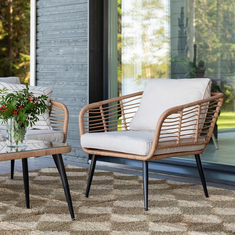 Polyrottinkinen Scandic nojatuoliScandic nojatuoli on moderni ja skandinaavinen polyrottinkinen nojatuoli ulos. Kesäinen nojatuoli muhkealla pehmusteella takaa rennot kesäpäivät. Materiaali nojatuolissa on UV-suojattua polyrottinkia ja runko on mustaksi maalattua metallia. Polyrottinki on kestävä ja helppohoitoinen materiaali terassille ja parvekkeelle.