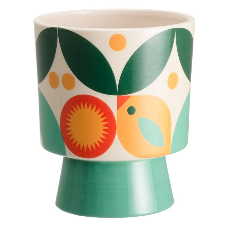 Birdie on keraaminen suojaruukku, jonka raikas graafinen kuvio hurmaa vihreän, oranssin ja keltaisen sävyissä. Selkeä sylinterimuoto sopii moneen tyyliin ja korostaa kasvin kauneutta.