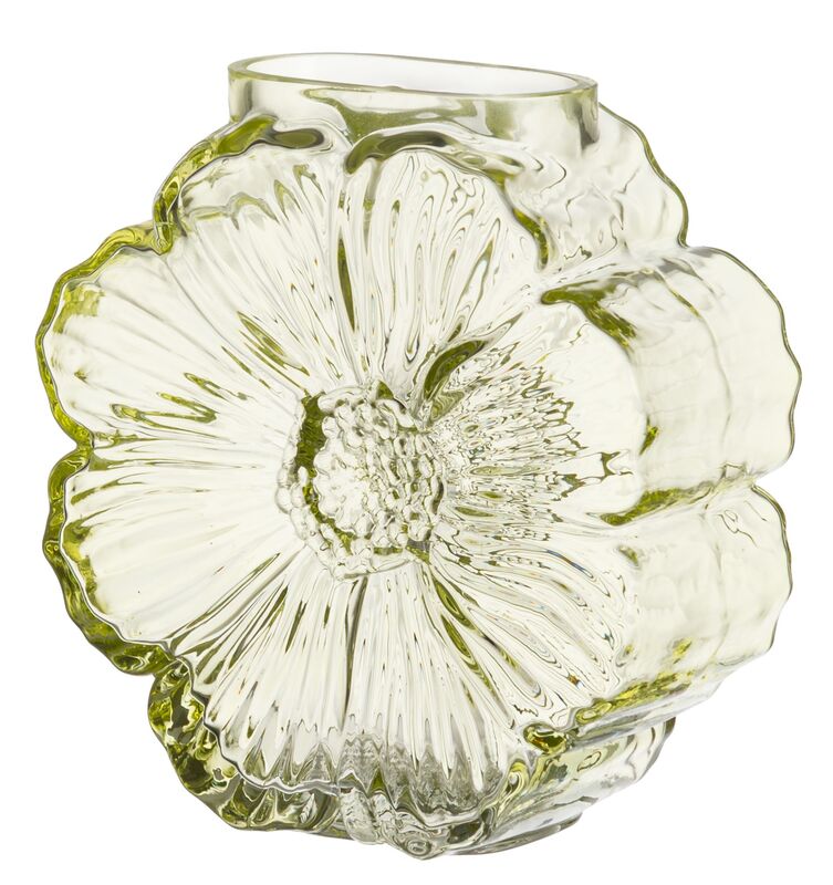 Flora maljakko tuo sisustukseen kevyen vaaleanvihreän sävyn ja kukkateeman kauniin muodon. Pintavärjätty lasi heijastaa valoa pehmeästi. Käsintehty maljakko on aina hieman yksilöllinen. Suositellaan käsinpesua.