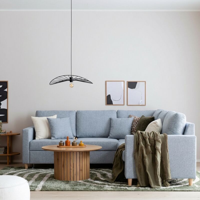 Aada kulmavuodesohva laadukkaalla verhoilulla- Ilmava vuodesohva, korkeilla jaloilla