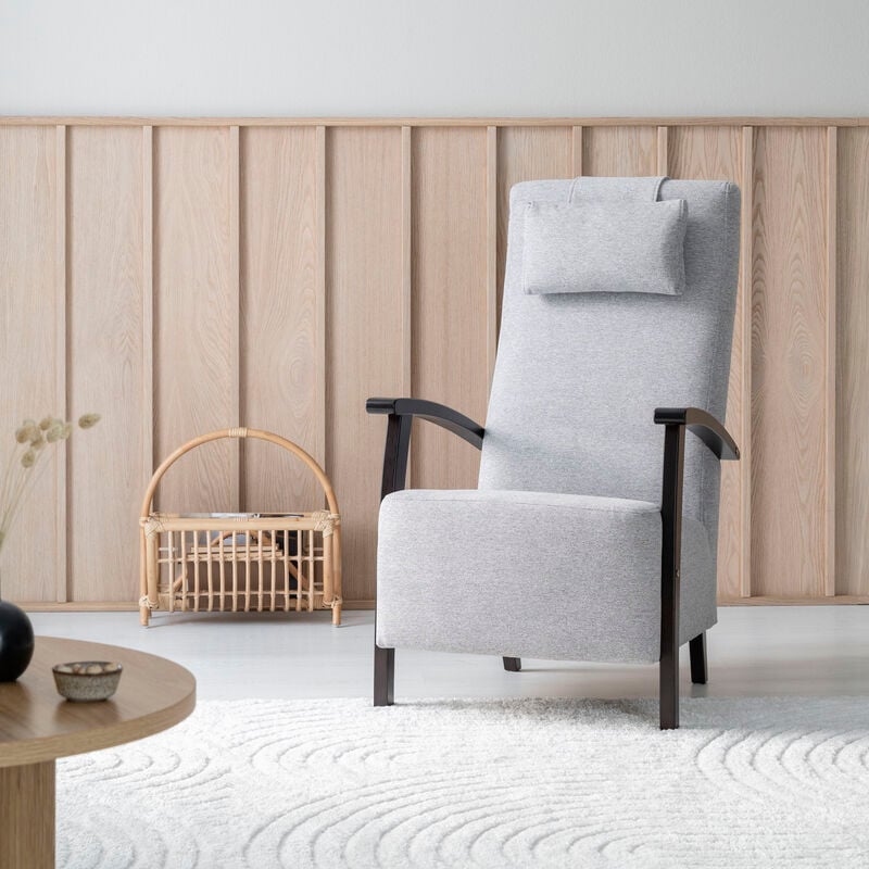 Laadukas kotimainen nojatuoli, jossa korkea selkänoja ja niskatyyny takaavat miellyttävän istuinasennon.