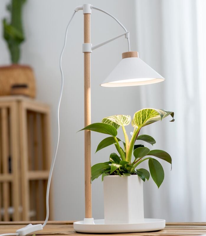 Valaisinkuvun korkeutta voi säätää portaattomasti kasvin tarpeiden mukaan, mikä tekee valaisimesta monipuolisen eri kokoisille viherkasveille. Puuvarsi on kiinnitetty pyöreään tarjottimeen, jolle kukkaruukku asettuu luontevasti ja siististi. Kuvun ja tarjottimen muovinen materiaali on kevyt ja helppohoitoinen. Kasvivalaisin on käytännöllinen valinta kotiin, jossa halutaan tukea kasvien hyvinvointia ilman monimutkaisia ratkaisuja ja säilyttää samalla harkittu, rauhallinen ilme.
