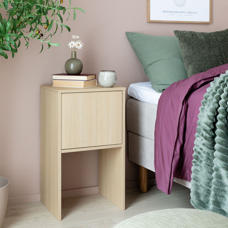 Alava yöpöytä on täydellinen valinta makuuhuoneeseen, jossa arvostetaan selkeyttä ja helppoutta. Pelkistetty muotoilu antaa tilaa omalle tyylille ja sulautuu luontevasti niin moderniin, kuin pehmeämpäänkin sisustukseen. Yöpöydän melamiinipinta on helppo pitää puhtaana. Kätevä kaappi kätkee sisäänsä iltalukemiset, laturit ja muut pienet tarvikkeet, jolloin makuuhuone pysyy rauhallisena ja selkeänä. Korkea rakenne jättää myös tilaa lattialle, mikä keventää ilmettä ja helpottaa siivoamista.