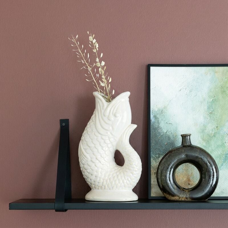 Leikkisä kalamaljakko tuo sisustukseen persoonallista ilmettä. Kiiltävä valkoinen pinta ja näyttävä muoto tekevät siitä katseenvangitsijan niin kukille kuin sellaisenaan.