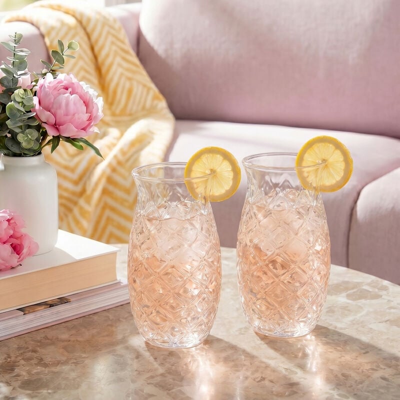 Ananas juomalasit – 2 kpl lasitKauniisti kuvioidut Ananas juomalasit tuovat kattaukseen hienovaraista ilmettä. Lasin pintakuvio elävöittää ulkonäköä ja saa juoman näyttämään raikkaalta ja houkuttelevalta ilman liiallista korostusta. Sisältää kaksi 525 ml juomalasia.