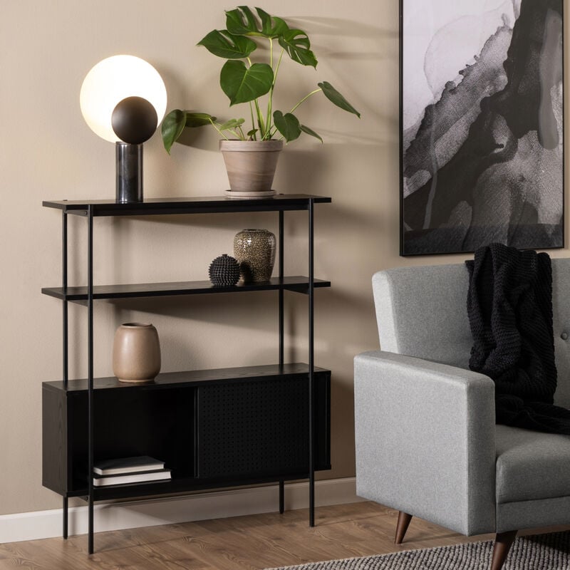 Angus-kirjahylly yhdistää mattamustan teräsrungon ja mustan puukuosin. Avohyllyt kukille ja koriste-esineille, alakaapissa rei’itetyt metalliset liukuovet pientavaroille. Kevyt, moderni ja helppohoitoinen.