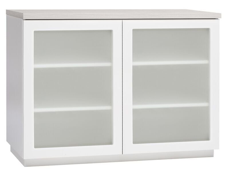 Runko ja sokkeli ovat 16 mm kalustelevyä, taso 25 mm kalustelevyä. Ovet ovat karkaistua turvalasia, joka rikkoutuessaan murenee pieniksi paloiksi eikä siinä ole leikkaavaa reunaa. Turvallinen valinta vilkkaisiin perhetiloihin ja kestävä arjen käyttöön. Ovi sulkeutuu pehmeästi push-open-mekanismilla, joten käyttö on miellyttävää. Kaapin linjakas muotokieli on helppo yhdistää monenlaiseen sisustukseen. Valkoinen runko raikastaa tilaa ja korostaa kauniisti maitolasin läpi kuultavaa sommitelmaa.