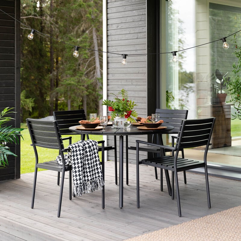 Arvid on 4-hengen pyöreä ruokailuryhmä ulkokäyttöön. Huoltovapaa teräsrunko on tukeva ja aintwood-kansi kestää hyvin säätä ja arjen käyttöä. Helppo pitää puhtaana kostealla pyyhkimällä.