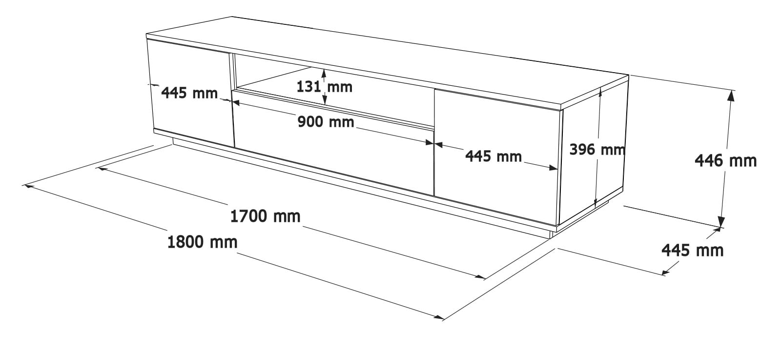 Tv-tasossa on runaasti säilytystilaa. Keskellä on 90 cm leveä avonainen hylly, josta johdot saa vietyä tv-tason taakse. Lisäksi keskeltä ja reunoilta löytyy kippiovien takaa säilytystilaa runsaasti.