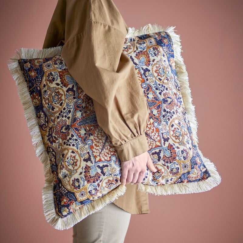Bloomingville Asu koristetyyny tuo sisustukseen lämpöä ja kuviollista ilmettä. Tyynyä koristaa näyttävä kukkakuvio ja lyhyt hapsureuna. Pehmeä polyesteritäyte tekee tyynystä mukavan lisän sohvalle, nojatuoliin tai sängylle.