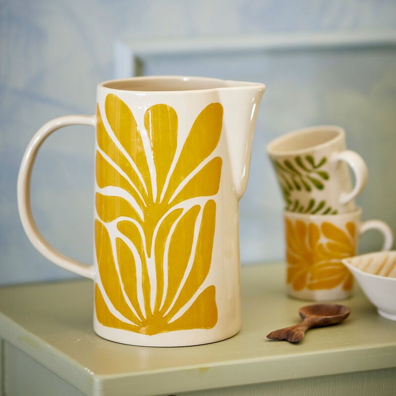 Bloomingville Creative Collectionin Fauni-kannu tuo pöytään lempeää väriä ja taiteellista ilmettä. Keraaminen pinta on koristeltu käsinmaalatulla, lämpimän keltaisella lehtikuviolla. Korkea ja linjakas muoto tekee kaatamisesta helppoa, ja kannu toimii yhtä hyvin veden ja mehun tarjoilussa kuin maljakkona kukille. Vetoisuus 2,17 litraa. Koska kannun koristelu tehdään käsin, kuvioissa ja sävyjen voimakkuudessa voi esiintyä pieniä eroja – jokainen kappale on ainutlaatuinen.