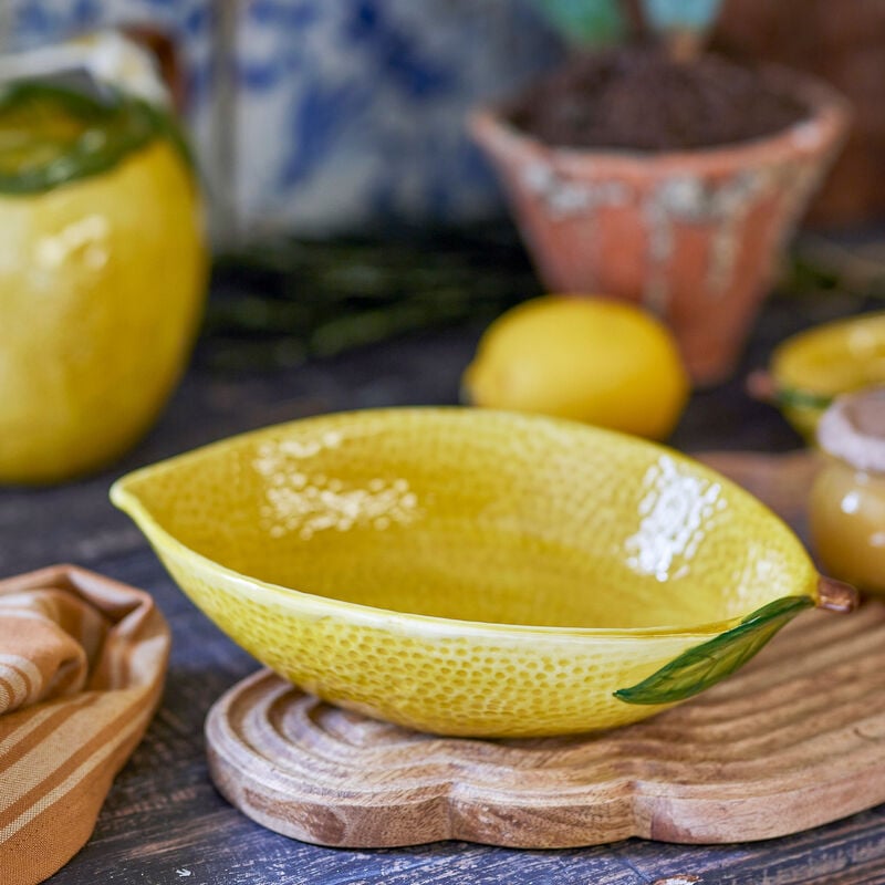 Sitruunanmuotoinen keraaminen kulho piristää kattauksen. Astianpesukone-, mikro- ja uunikelpoinen. Eloisa kuorimainen tekstuuri. Pienet muoto- ja sävyerot mahdollisia; osa pinnasta on käsin koristeltu.