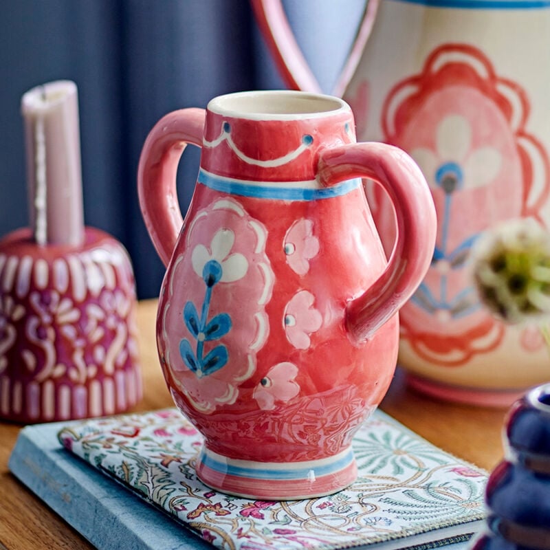 Bloomingville Odina 15 cm on pieni, mutta näyttävä maljakko, joka tuo kotiin iloista väriä. Syvänpunainen lasitus ja käsinmaalattu kukkakuvio sinisen, vaaleanpunaisen ja valkoisen sävyissä tekevät jokaisesta kappaleesta yksilön. Muoto on napakka kahvoineen, joten maljakko toimii hyvin yksittäiselle oksalle, muutamalle kukalle tai ilahduttavana koristeena sellaisenaan hyllyllä.