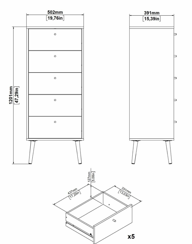 Bodo kapea lipasto 5-laatikolla valkoinen