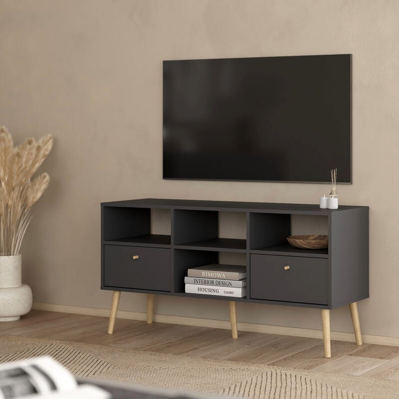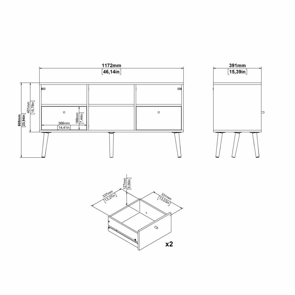 Moderni tv-taso avohyllyillä ja laatikoillaBodo tv-taso on kompakti mutta monipuolinen ratkaisu olohuoneen säilytykseen. Avohyllyihin on helppo sijoittaa digiboksit, pelikonsolit tai sisustusesineet, ja kahteen vetolaatikkoon saa piiloon kaukosäätimet, johdot ja muut pienet tarvikkeet.