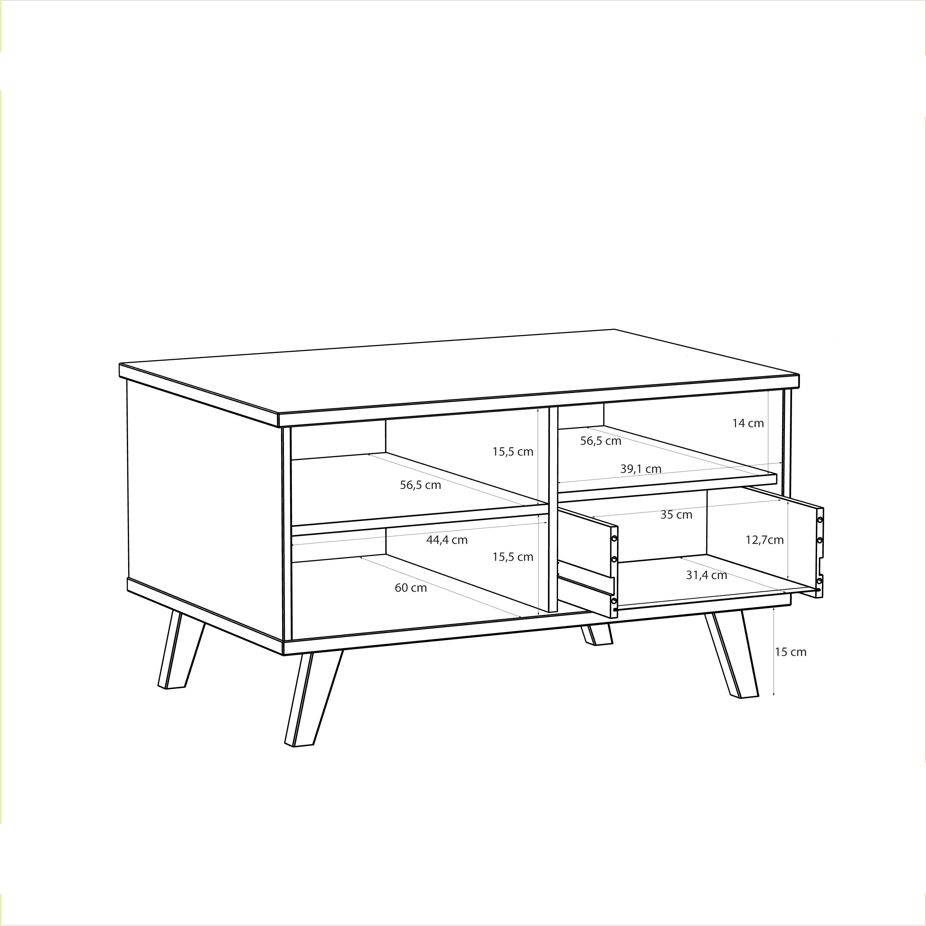 Sohvapöydässä on avohyllyt ja yksi laatikko, jotka tarjoavat käytännöllistä säilytystilaa lehdille, kaukosäätimille ja muille pientavaroille. Tilava kansitaso sopii tarjoiluun tai sisustusesineille.