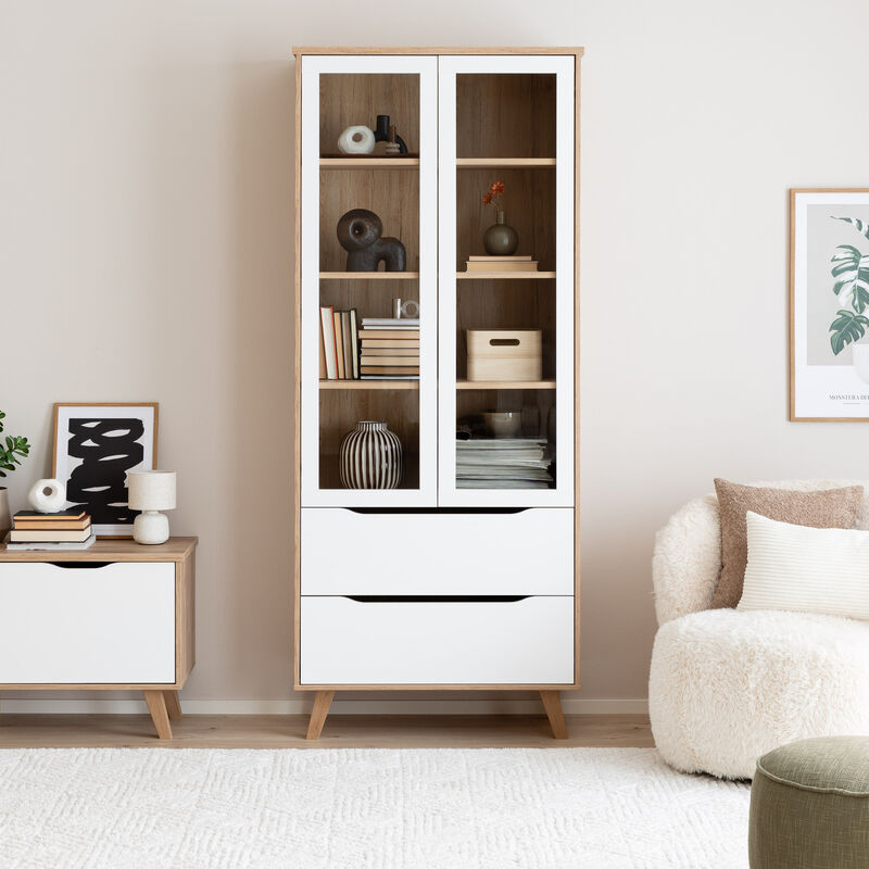 Tyylikäs vitriini lasiovilla, kahdella kiinteällä ja kahdella säädettävällä hyllyllä sekä kahdella laatikolla. Tarjoaa runsaasti säilytystilaa ja ajattoman ilmeen.