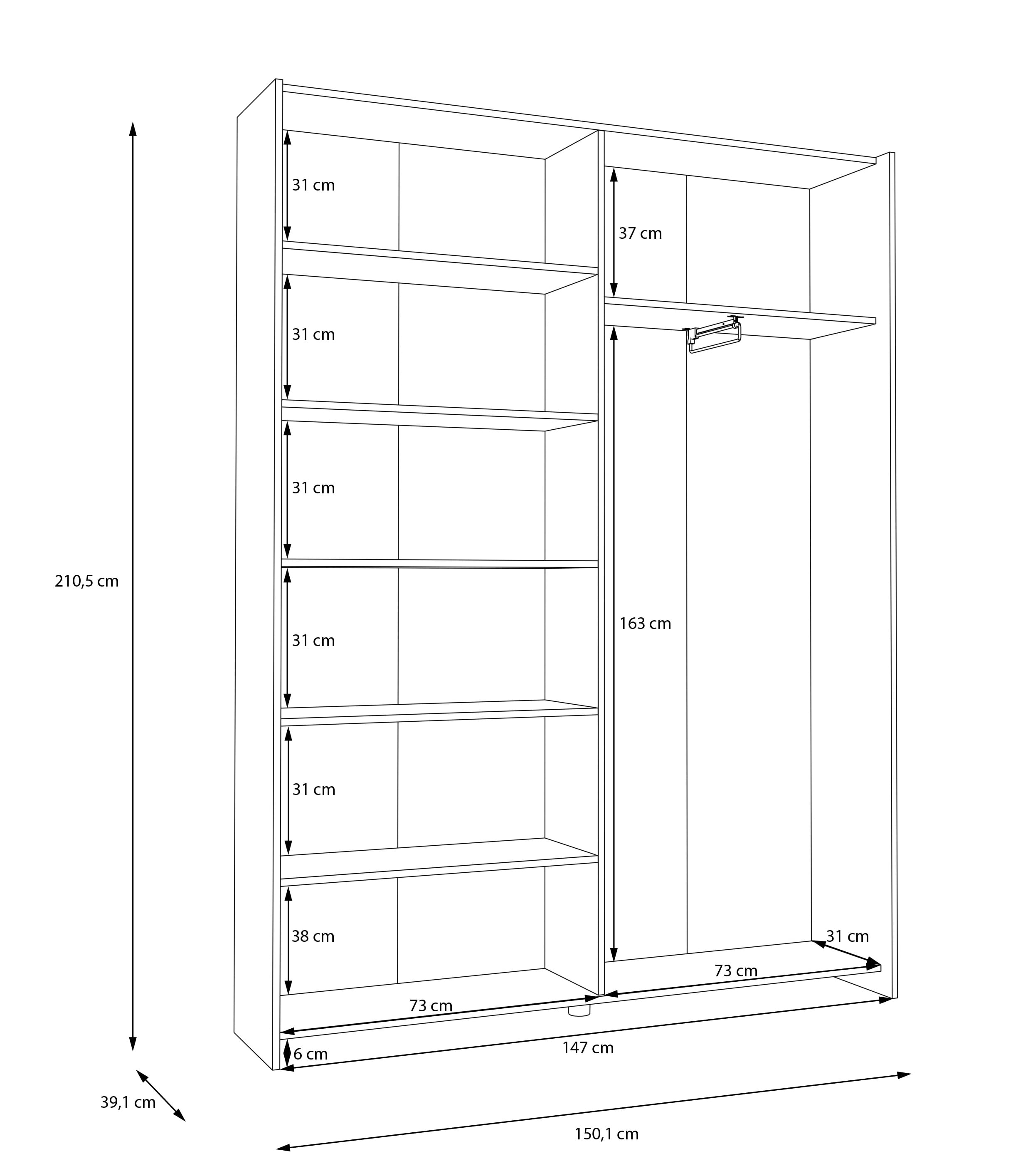 Tyylikäs Candy vaatekaappi liukuovilla 150x210Candy liukuovikaappi on käytännöllinen valinta, kun tarvitset säilytystilaa kompaktisti. Sen alle 40 cm syvyys tekee siitä erinomaisen ratkaisun eteiseen, makuuhuoneeseen tai muihin kapeampiin tiloihin, joissa jokainen sentti on tärkeä. Liukuovet liikkuvat kevyesti metallikiskoilla, joten kaapin käyttö on sujuvaa myös silloin, kun tilaa ovien avaamiseen ei ole ylimääräistä.