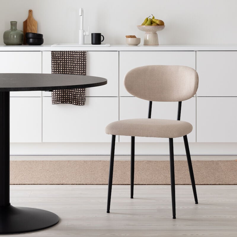 Pehmustetut ja tukevat istuinosat tekevät Danielista erinomaisen valinnan niin ruokapöydän ääreen kuin työtuoliksi kotitoimistoon. Mustat metallijalat tuovat ilmeeseen modernia kontrastia, ja muoviset tassut suojaavat lattiaa naarmuuntumiselta.