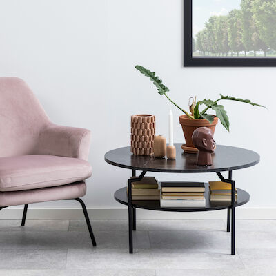 Day Retro pyöreä sohvapöytä mustilla metallijaloilla ja tammenvärisellä kannella ja hyllylevyllä.