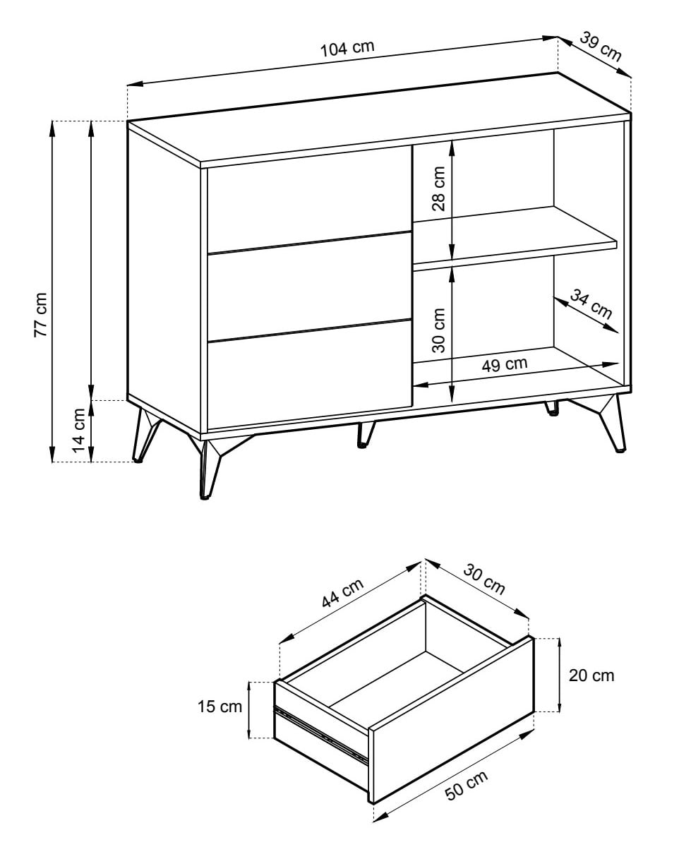 Tyylikäs Dumont lipasto 104x39x77 cmTyylikäs ja näyttävä Dumont lipasto kaapilla ja kolmella laatikostolla. Lipaston etusarjat ovat tammen väriset, runko ja jalat ovat mustat. Kaapin ovessa kaunis koristeellinen kuviointi. Laatikoissa ja kaapissa push-to-open mekanismi. Lipaston takaosa on valmistettu taustalevystä, joten se on suunniteltu sijoitettavaksi seinää vasten.