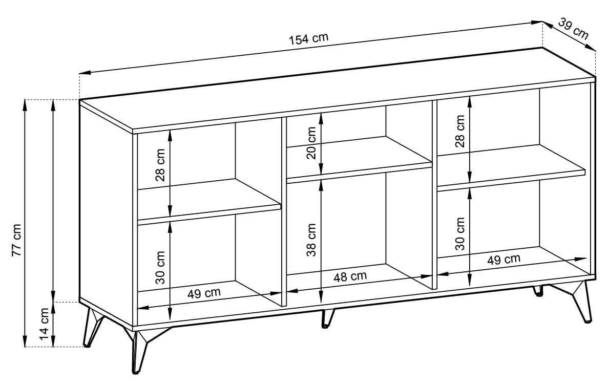 Tyylikäs Dumont senkki 154x39x77 cm, jossa on kolme tilavaa kaappia. Jokaisessa kaapissa on välihylly. Ovet tammen väriset, runko ja jalat mustat.