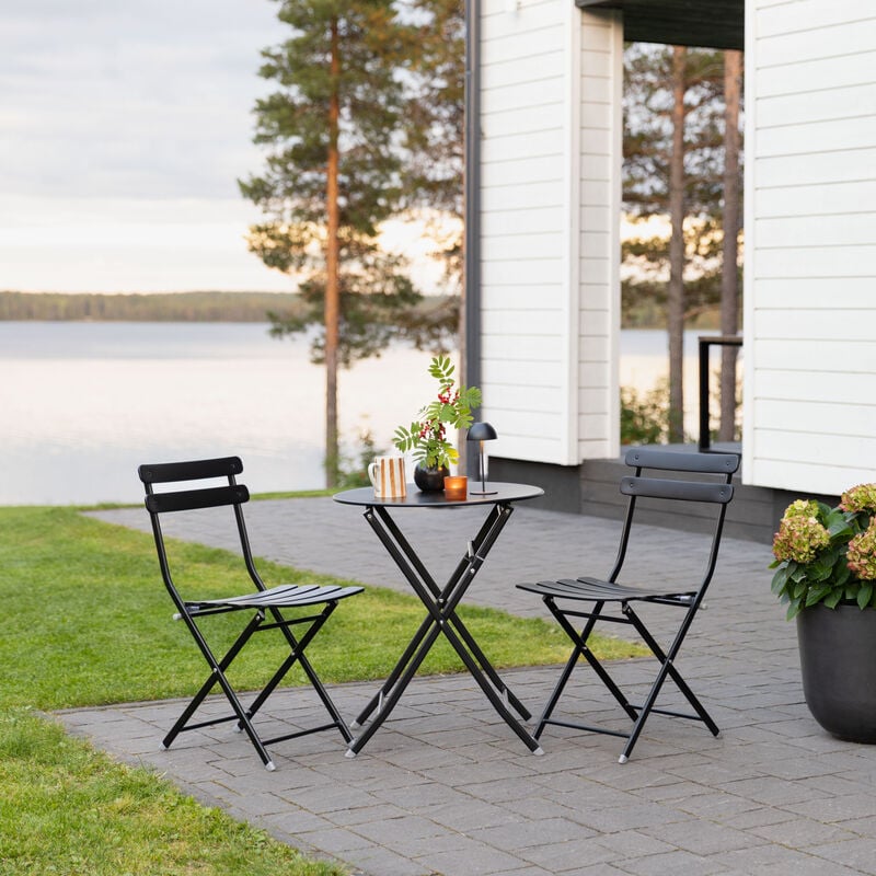 Edvin parvekesetti tekee pienestäkin parvekkeesta viihtyisän kahvipaikan. 60 cm pyöreä teräspöytä ja kaksi kokoontaittuvaa tuolia ovat kevyet siirtää ja helppo säilyttää, kun tila tai sää niin vaatii.