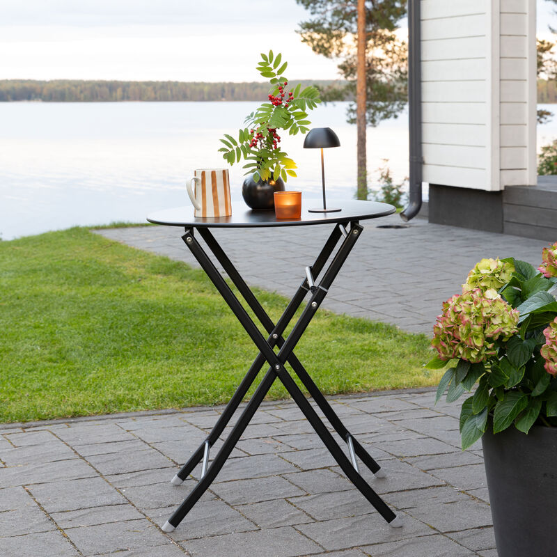 Edvin taittopöytä on siro ja käytännöllinen valinta parvekkeelle, terassille tai pihaan. Pyöreä 60 cm kansi tarjoaa sopivasti tilaa kahvihetkille ja taittuva metallirakenne tekee pöydästä helpon siirtää ja säilyttää.