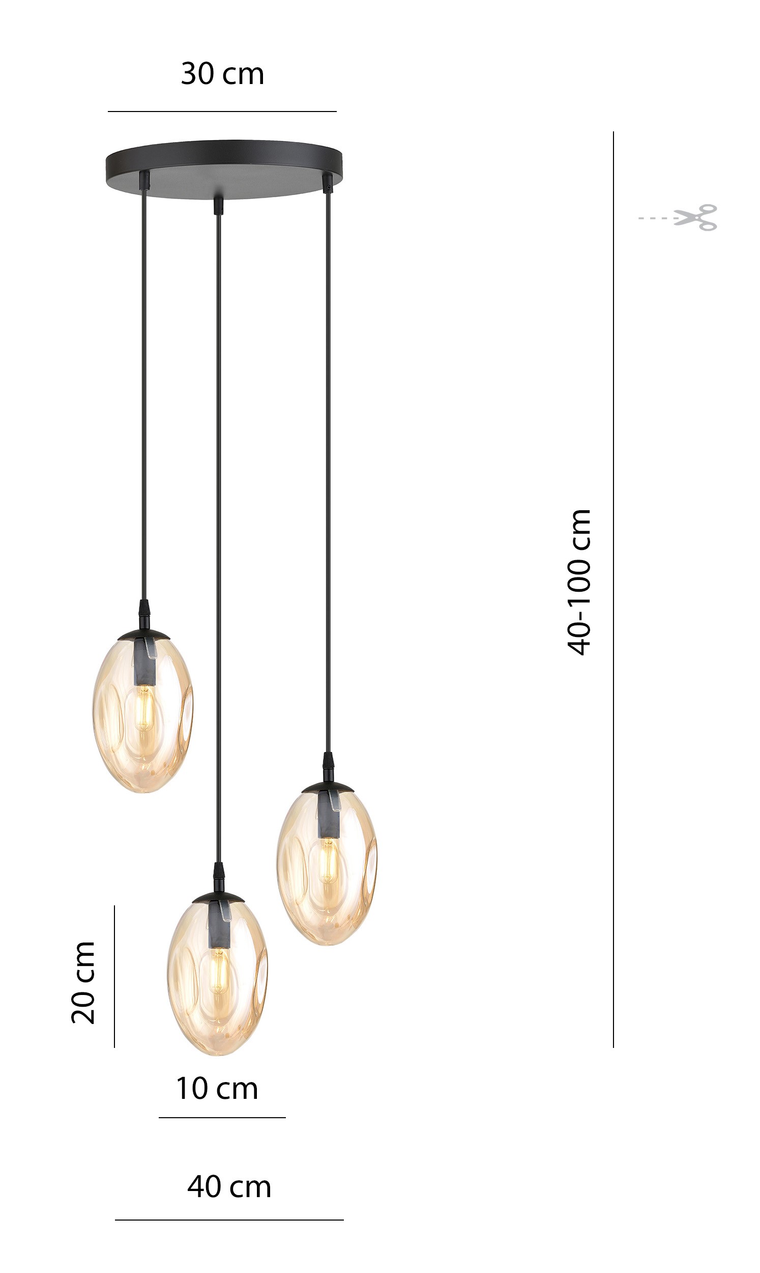 Tyylikäs riippuvalaisin lasikuvuilla. Valaisimen kaikkia kolmea varjostinta voi vapaasti säätää 40-100 cm:n välillä.