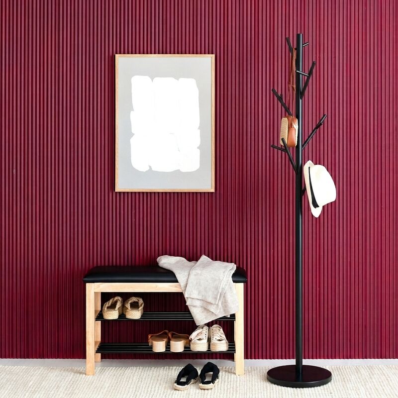 Useille eri korkeuksille sijoitetut koukut tarjoavat reilusti tilaa takeille, laukkuille ja arjen asusteille. Näin jokaiselle tavaralle löytyy oma paikkansa ja arki sujuu vähän kevyemmin. Tukeva metallirunko pitää naulakon napakasti paikoillaan ja kompakti jalusta tekee siitä toimivan myös pienemmissä tiloissa.