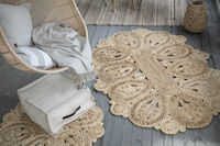 Kaunis ovaalin mallinen juuttimatto. Soveltuu sisälle ja katettuihin ulkotiloihin. Saatavilla myös pyöreänä.