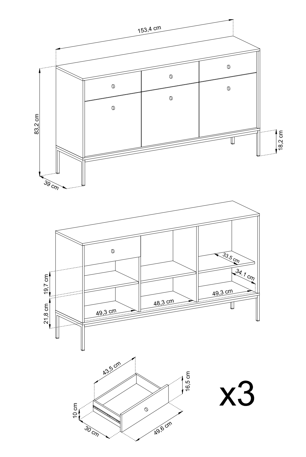 Hienostunut Fine senkki 153x39x83 cmFine senkki tuo tyylikkyyttä ja toimivuutta kodin säilytysratkaisuihin. Kolmen oven ja kolmen laatikon ansiosta saat järjestettyä tavarat hyvin omiin osastoihinsa, mikä helpottaa arjen järjestystä.