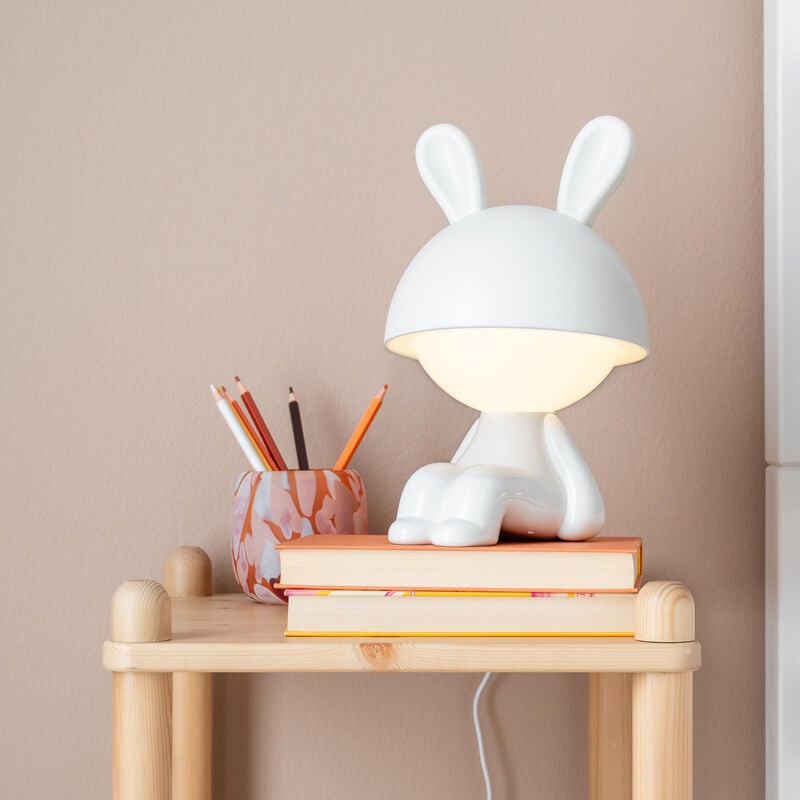 Suloinen tyttö pupu-yövalo, jossa kolmiportainen kosketushimmennin. Luo pehmeää valoa iltasatuihin ja yöhön. Toimii USB-johdolla ja adapterilla. Sisäkäyttöön (IP20).