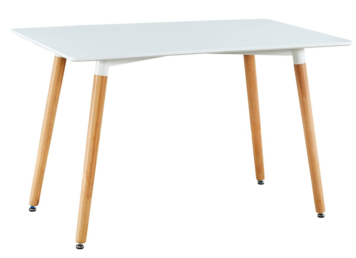 Tyylikäs Fox ruokapöytä, koossa 140 cm x 80 cm. Pöydän kansi on valmistettu valkoiseksi maalatusta MDF-levystä ja jalat luonnonvärisestä pyökkipuusta.