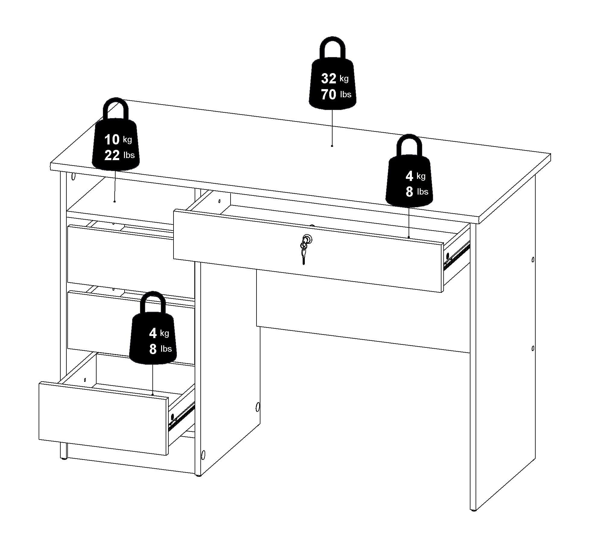 Säilytystilaa on mietitty arjen tarpeisiin. Kolme vetimetöntä laatikkoa tarjoavat reilusti tilaa papereille, tarvikkeille ja muille työpöydän tärkeille asioille. Lisäksi pöydästä löytyy lukittava laatikko, jossa pidät tärkeimmät tavarat turvallisesti tallessa. Laatikoiden laakeroidut kiskot tekevät käytöstä sujuvaa ja miellyttävää.