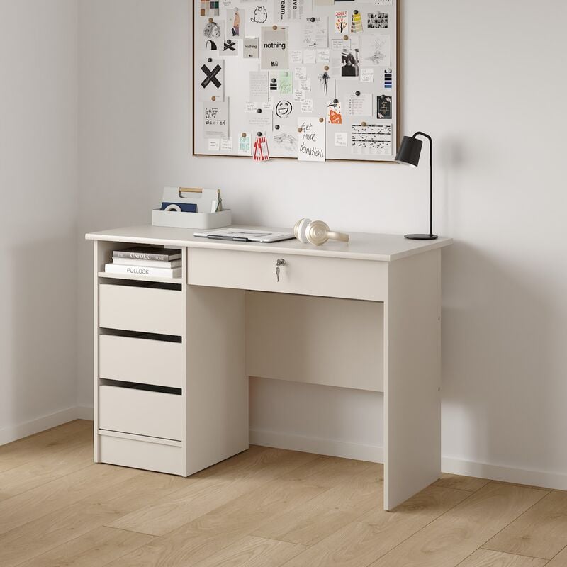 Funktion työpöytä yhdistää selkeän muotoilun ja toimivan säilytyksen. Kolme tilavaa laatikkoa, lukittava laatikko sekä avohylly pitävät arjen tärkeät tavarat järjestyksessä. Kompakti koko sopii erityisesti pieniin tiloihin.