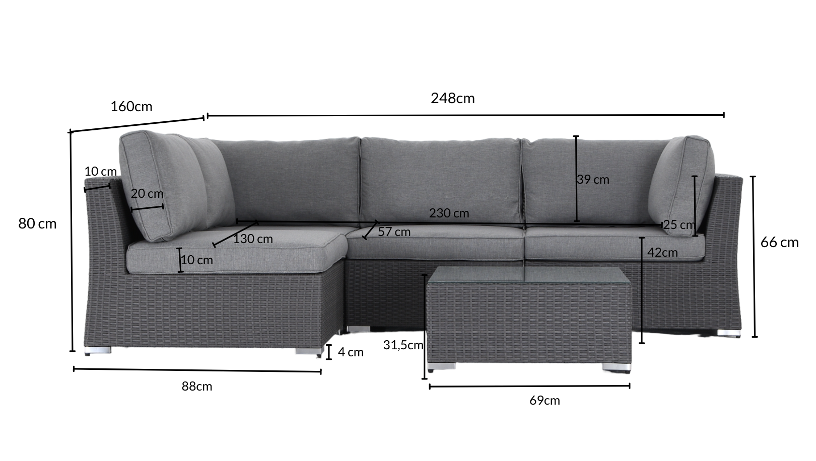 Muhkeilla pehmusteilla varusteltu avokulmasohva, sekä sohvapöytä. Runko alumiinia ja punos polyrottinkia.