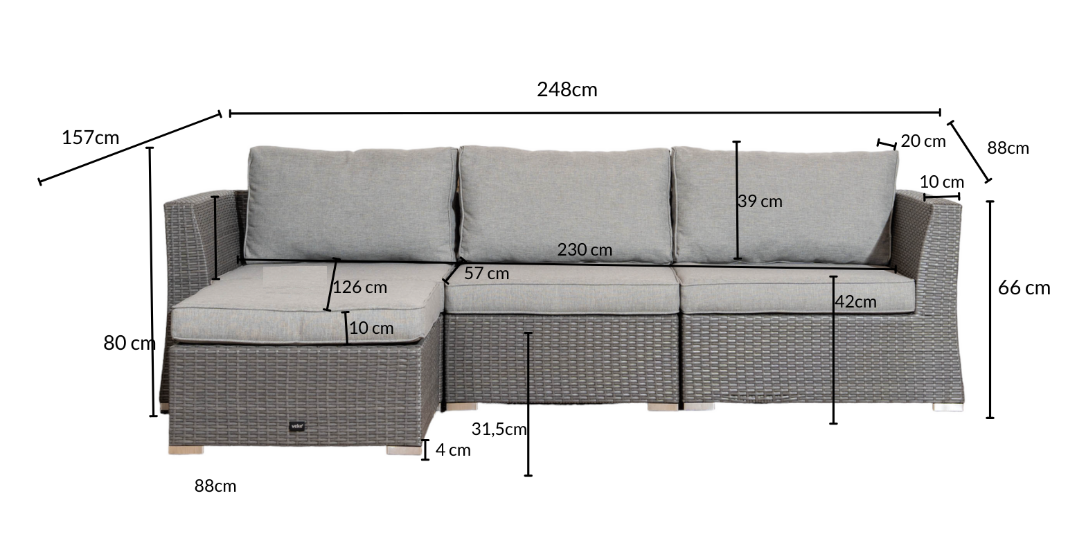 Polyrottinkinen divaanisohva muhkeilla pehmusteilla. Pehmusteiden päälliset on vettä hylkivät, irroitettavat ja käsin pestävissä.