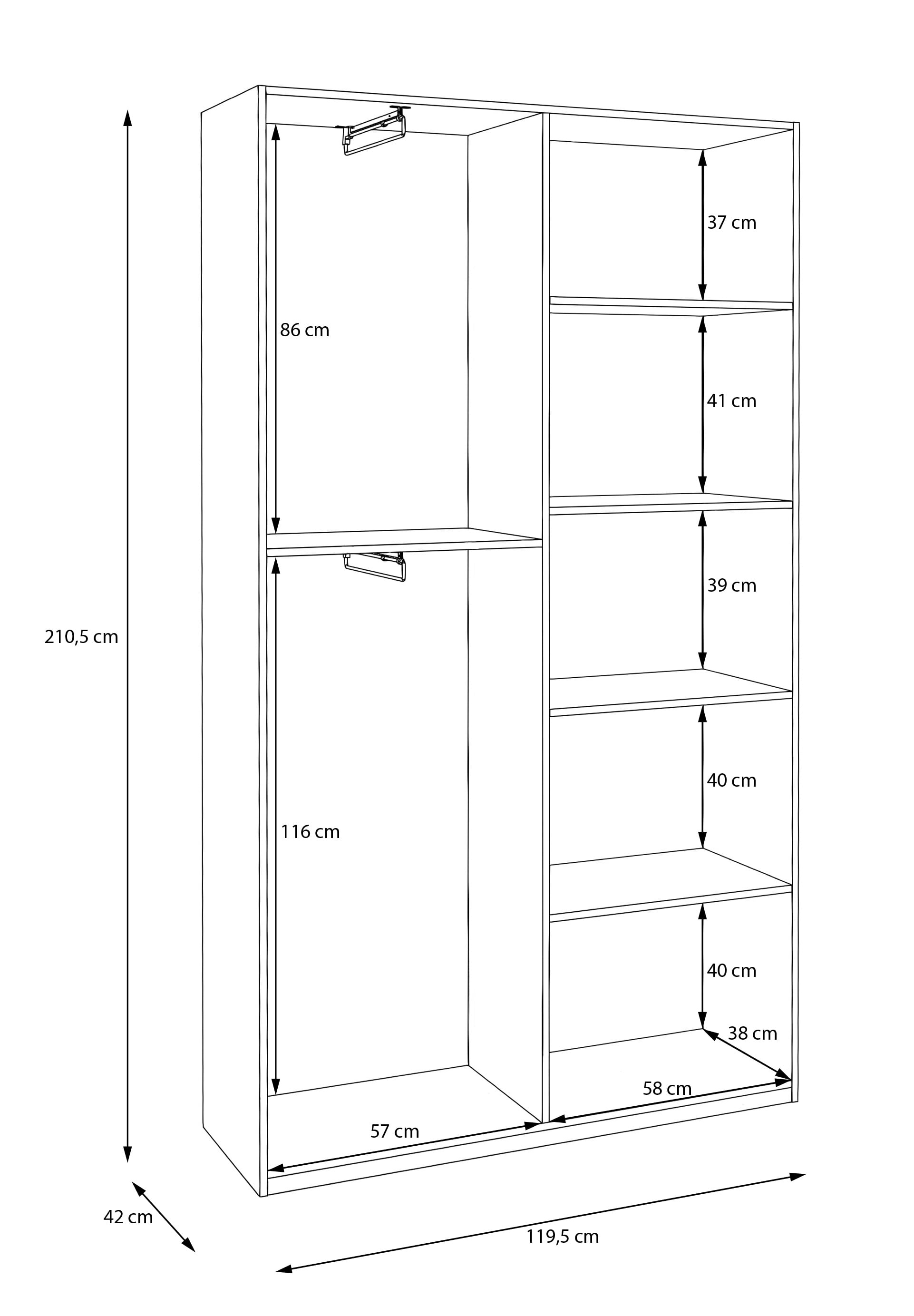 Homebox vaatekaappi 120x210Tämä saranaovikaappi on helppo ja toimiva valinta, kun tarvitset säilytystilaa kompaktissa koossa. Alle 42 cm syvyys tekee siitä hyvän ratkaisun pienempiin huoneisiin, kuten makuuhuoneeseen, vierashuoneeseen tai eteiseen, jossa tilaa on rajallisesti.