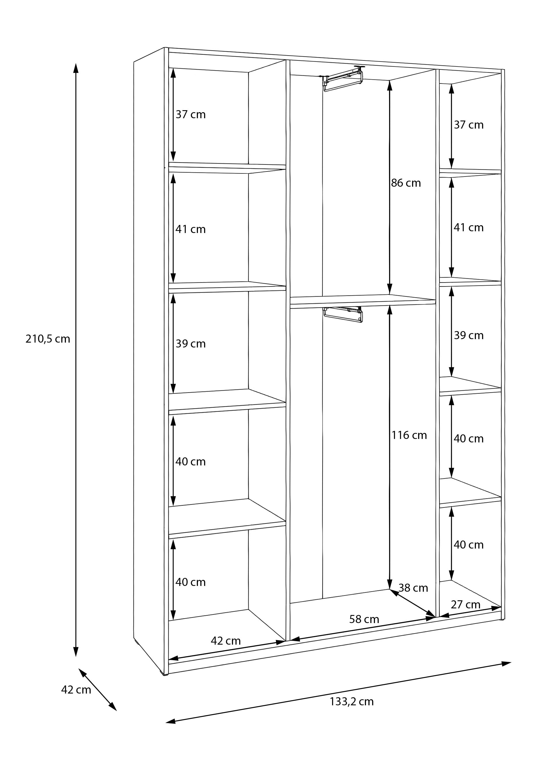 Homebox vaatekaappi 133x210Tämä saranaovikaappi on helppo ja toimiva valinta, kun tarvitset säilytystilaa kompaktissa koossa. Alle 42 cm syvyys tekee siitä hyvän ratkaisun pienempiin huoneisiin, kuten makuuhuoneeseen, vierashuoneeseen tai eteiseen, jossa tilaa on rajallisesti.