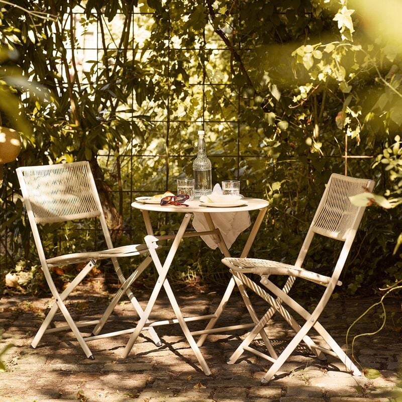 Settiin kuuluu pyöreä pöytä ja kaksi tuolia. Teräsrunko tekee kokonaisuudesta tukevan, ja polyesteripunos pehmentää ilmettä sekä tuo istuimiin miellyttävää tekstuuria. Vaalea sävy tekee kokonaisuudesta raikkaan ja helposti yhdisteltävän muiden ulkokalusteiden ja tekstiilien kanssa.