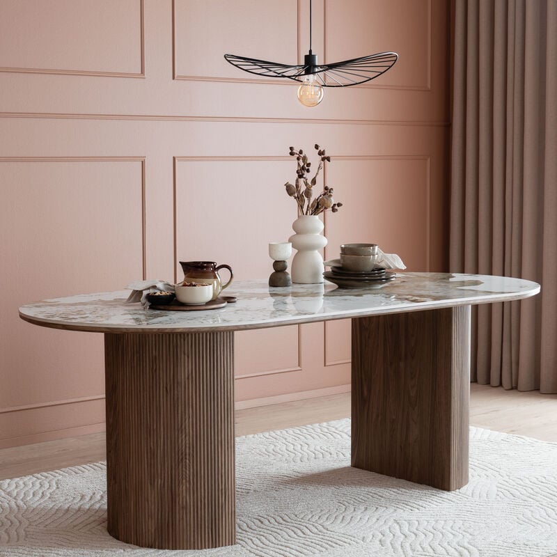 Upea House Nordic Athens ruokapöytä 210x100 cmHouse Nordic Athens -ruokapöytä on näyttävä mutta tasapainoinen valinta ruokailutilaan, jossa arvostetaan selkeää muotoilua ja käytännöllisiä materiaaleja. Pöydän lämminsävyinen runko tuo tilaan pehmeyttä ja kodikkuutta, kun taas vaalea keraaminen kansi lisää kokonaisuuteen kevyttä, kivimäistä ilmettä. Muotoilu on harkittu ja rauhallinen, ja pöytä sulautuu luontevasti monenlaisiin sisustustyyleihin modernista klassisempaan.