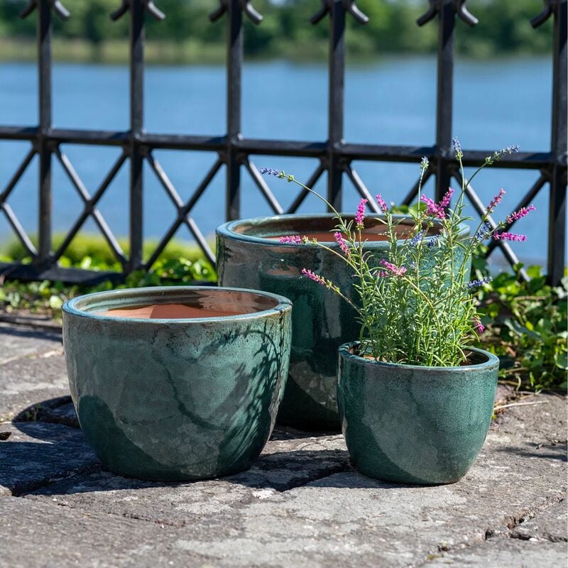 Kolmen keraamisen kukkaruukun setti (Ø21 x K16 cm, Ø30 x K23 cm, Ø38 x K28 cm) tuo raikasta ja modernia ilmettä sisä- ja ulkotiloihin. Lasitettu pinta ja merenvihreä sävy tekevät ruukuista näyttävän kokonaisuuden.