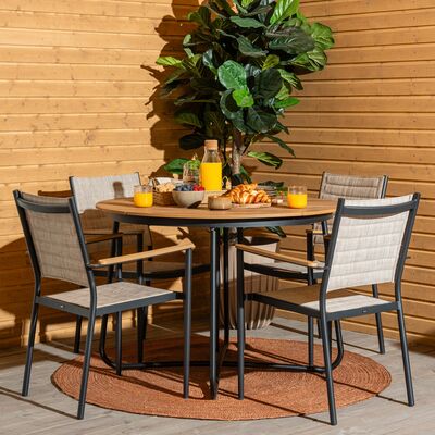 Tiikistä valmistettu 4-hengen ruokailuryhmä terassille. Pöytä ja tuolit ovat taitettavat, joten ne vievät säilytyksessä vain vähän tilaa. Tiikki on materiaalina hyvin kestävä, se kestää erilaiset säänvaihtelut sekä kuumuuden ja lämpötilojen vaihtelun. Sävy on kauniin kullanruskea, joka tuo ulkotilojen sisustukseen kodikasta tunnelmaa.