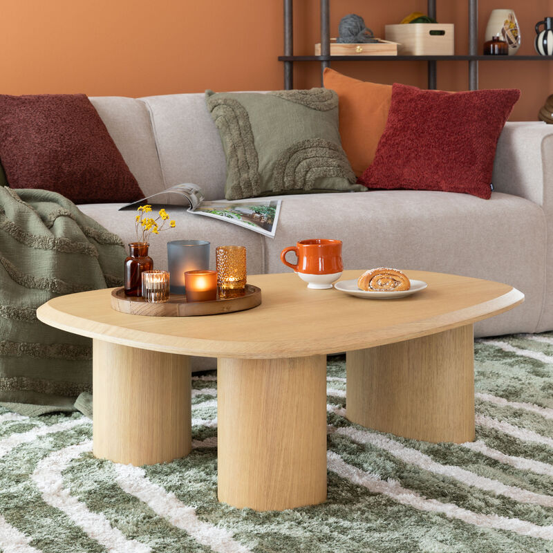 Näyttävä sohvapöytä, joka hurmaa pyöristetyillä muodoillaan ja massiivisilla jaloillaan. Kannen saarniviilupinta tuo eläväisyyttä puunkuvioinnilla. Täydellinen valinta rohkeaan ja ajattomaan sisustukseen!