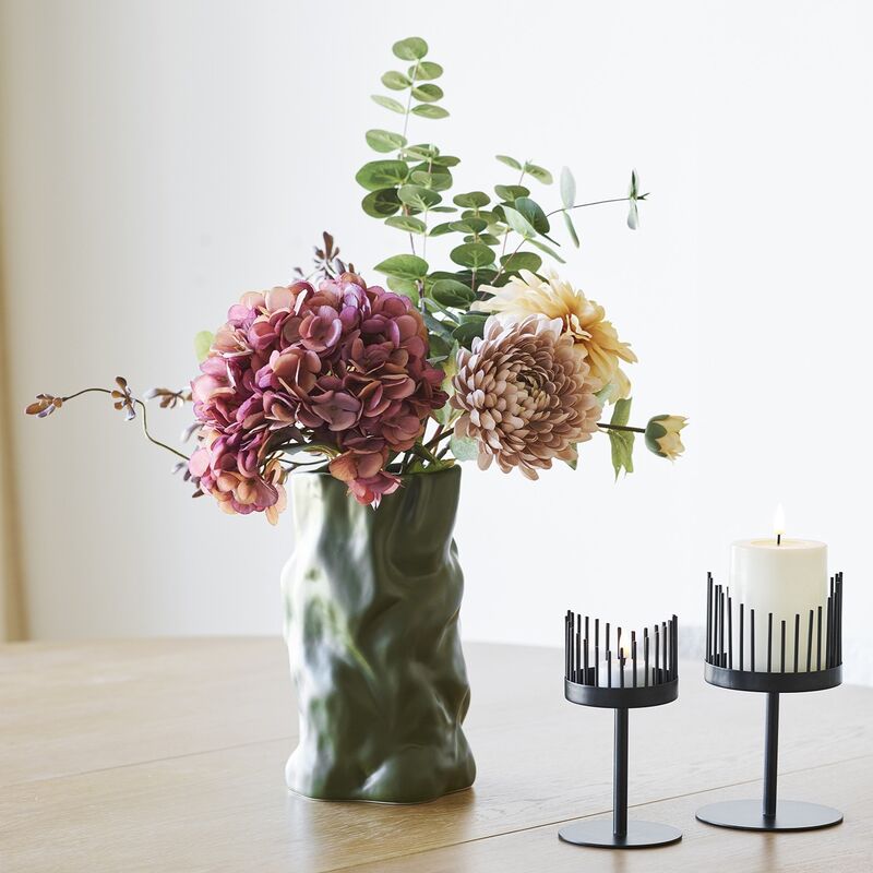 Veistoksellinen keraaminen vaasi tuo kotiin luonnonläheistä ilmettä. Orgaaninen, rypytetty muoto ja lämmin vihreä sävy sopivat sekä kukkakimpulle että kuivakukille. Koko 15×15×25,5 cm. Kaunis myös sellaisenaan.