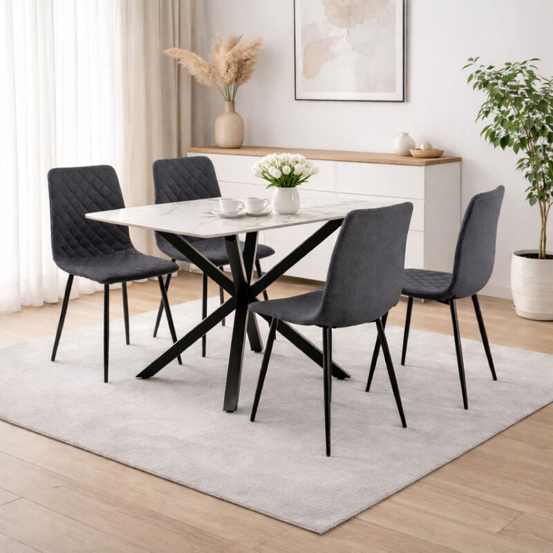 Izzy ruokapöytä 120x80 cm yhdistää näyttävän marmorikuvioidun sintratun kivikannen ja mustan metalliristikkojalan. Helppohoitoinen ja kestävä valinta arkeen. Tyylikäs pöytä, joka tuo ruokailutilaan ryhtiä ja valoa.