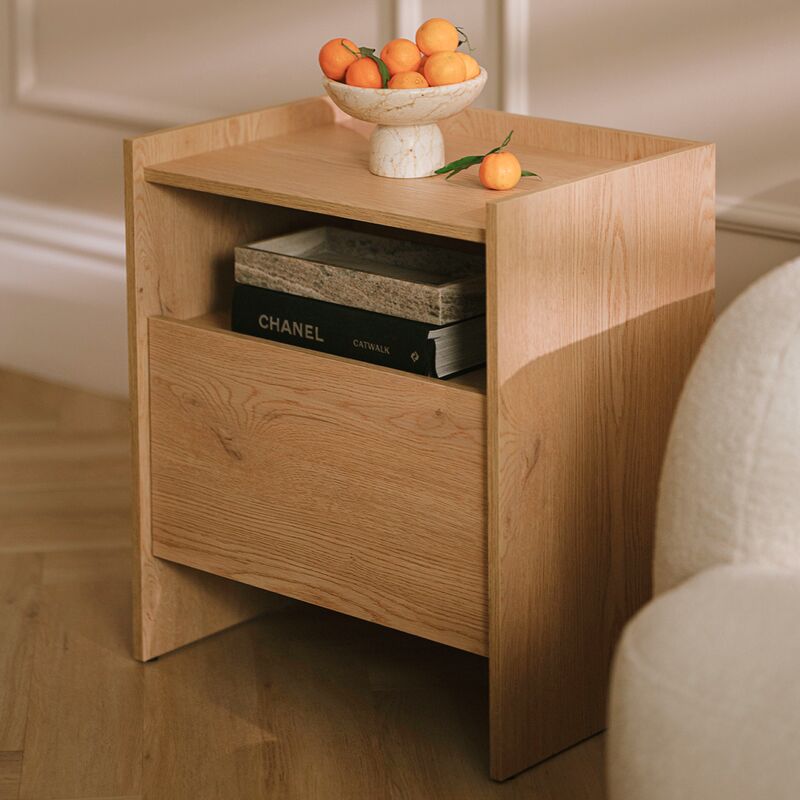 Tämä Japandi-tyylinen yöpöytä yhdistää skandinaavisen selkeyden ja japanilaisen rauhallisuuden luontevaksi osaksi makuuhuonetta. Suoraviivainen muotoilu ja lämmin puunsävyinen pinta tekevät ilmeestä ajattoman ja helposti yhdisteltävän erilaisiin sisustustyyleihin.